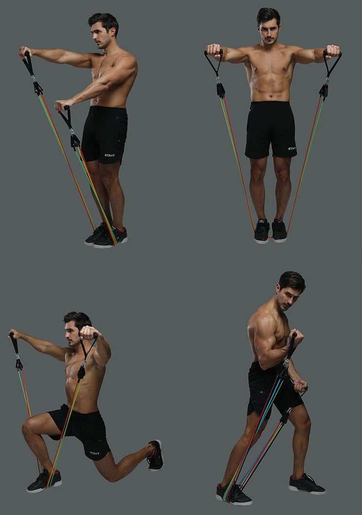 11-piece set of tension device details: 5 tension ropes, 2 handles, 2 ankle straps, 1 door anchor and 1 cloth bag