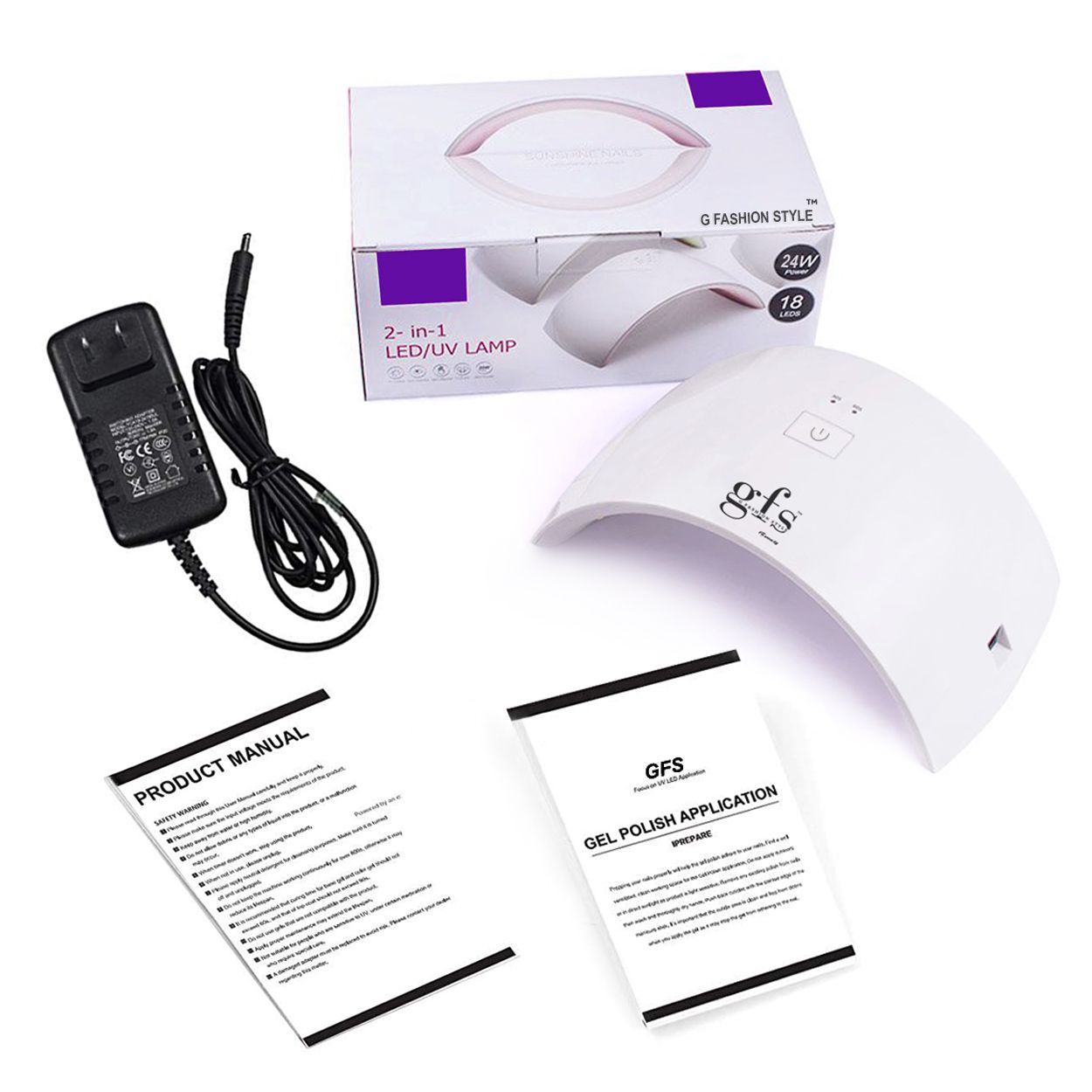 ✔️•Package Including : 1 x GFS UV LED Nail Lamp, Model SUN9C white, 1 x Power adapter ( US Plug) , 1 user manual.